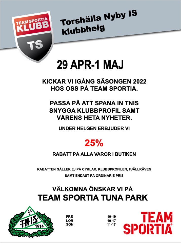 Välkomna till Team Sportia i helgen! Passa på att köpa TNIS klubbprofil eller andra varor, Team Sportia erbjuder dessutom en kraftig rabatt hela helgen. Välkomna! Torshälla-Nyby IS 26 apr 2022 0kommentarer