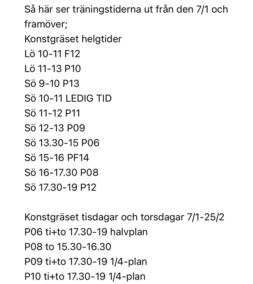 Hej och God Fortsättning på det nya året. Coronan har ställt till det nu när träningen inför årets säsong startar upp. Torshargshallen och Fotbollshallen är stängda, till att börja med till och med den 24/1, men det kan bli ytterligare förlängning av stängda hallar. Konstgräset är öppet om vädret är gynnsamt, men blir det isfläckar på planen så går den på grund av skaderisk eller att planen kan bli förstörd inte att använda. Vaktmästarna besiktar planerna vid otjänligt väder. Om det är möjligt så ser man till att få planen träningsbar, men det kan tyvärr också vara så att man tvingas stänga planen ibland med hänvisning till ovanstående. Så här ser träningstiderna ut från den 7/1 och framöver; Konstgräset helgtider Lö 10-11 F12 Lö 11-13 P10 Sö 9-10 P13 Sö 10-11 LEDIG TID Sö 11-12 P11 Sö 12-13 P09 Sö 13.30-15 P06 Sö 15-16 PF14 Sö 16-17.30 P08 Sö 17.30-19 P12 Konstgräset tisdagar och torsdagar 7/1-25/2 P06 ti+to 17.30-19 halvplan P08 to 15.30-16.30 P09 ti+to 17.30-19 1/4-plan P10 ti+to 17.30-19 1/4-plan