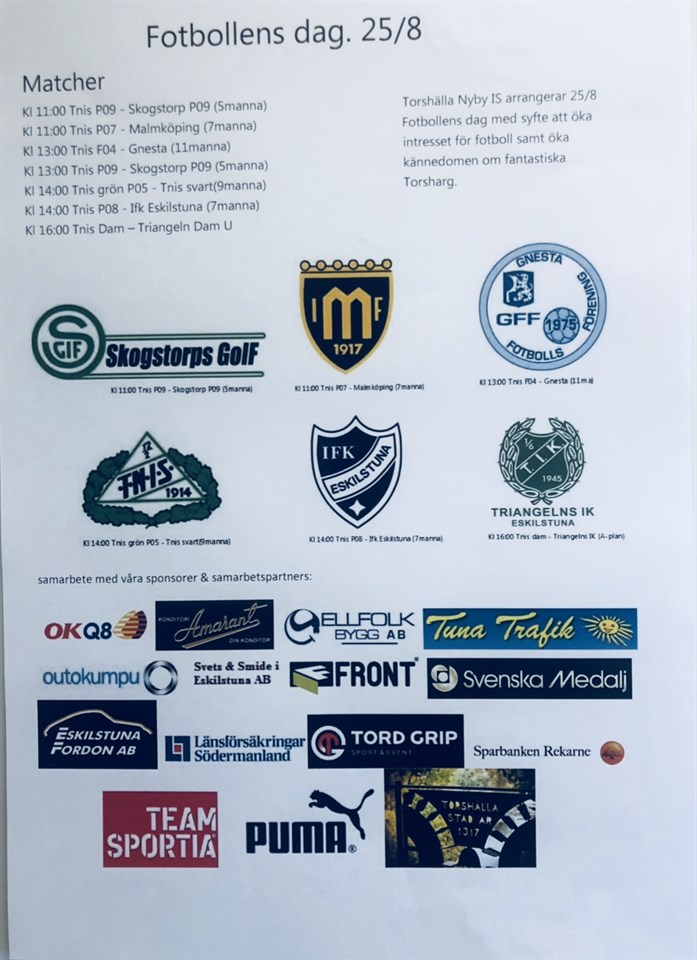 TNIS välkomnar våra motståndare,publik,domare och våra grymma sponsorer till Fotbollens Dag. Hoppas vi ses Lördagen 25/8 på Torshällas vackraste plats Torshargs IP. Forza TNIS 💚 Torshälla-Nyby IS 15 aug 2018 0kommentarer