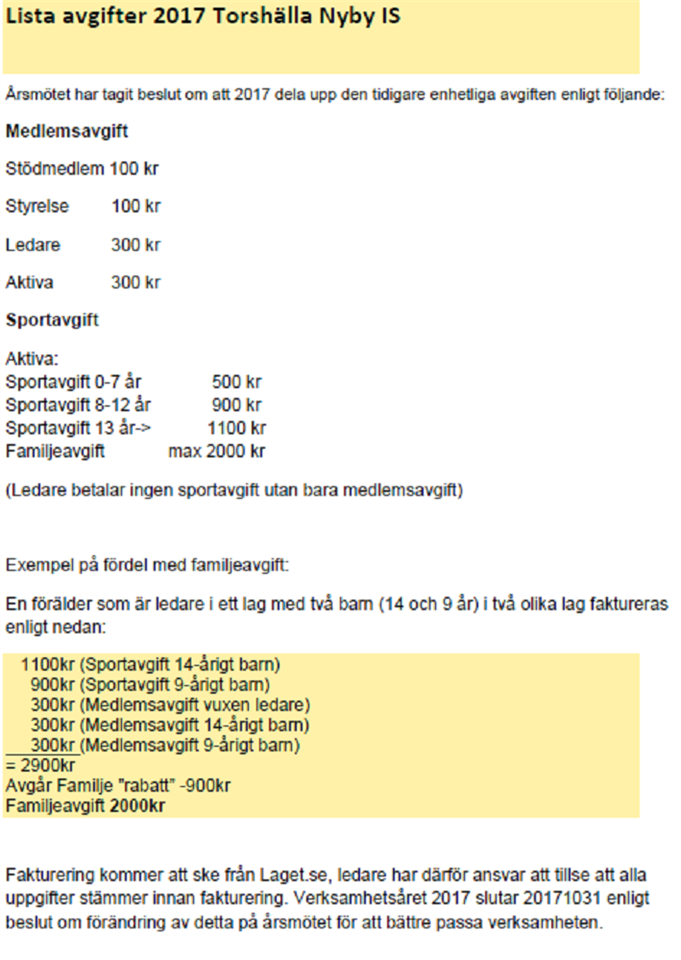 Lista avgifter 2017 Torshälla Nyby IS Årsmötet har tagit beslut om att 2017 dela upp den tidigare enhetliga avgiften enligt följande: Medlemsavgift Stödmedlem 100 kr Styrelse 100 kr Ledare 300 kr Aktiva 300 kr Sportavgift Aktiva: Sportavgift 0-7 år 500 kr Sportavgift 8-12 år 900 kr Sportavgift 13 år-> 1100 kr Familjeavgift max 2000 kr (Ledare betalar ingen sportavgift utan bara medlemsavgift) Exempel på fördel med familjeavgift: En förälder som är ledare i ett lag med två barn (14 och 9 år) i två olika lag faktureras enligt nedan: 1100kr (Sportavgift 14-årigt barn) 900kr (Sportavgift 9-årigt barn) 300kr (Medlemsavgift vuxen ledare) 300kr (Medlemsavgift 14-årigt barn) 300kr (Medlemsavgift 9-årigt barn) = 2900kr Avgår Familje ”rabatt” -900kr Familjeavgift 2000kr Fakturering kommer att ske från Laget.se, ledare har därför ansvar att tillse att alla uppgifter stämmer innan fakturering. Verksamhetsåret 2017 slutar 20171031 enligt beslut om förändring av detta på årsmötet för att bättre passa verksamheten. Mvh Styrelsen